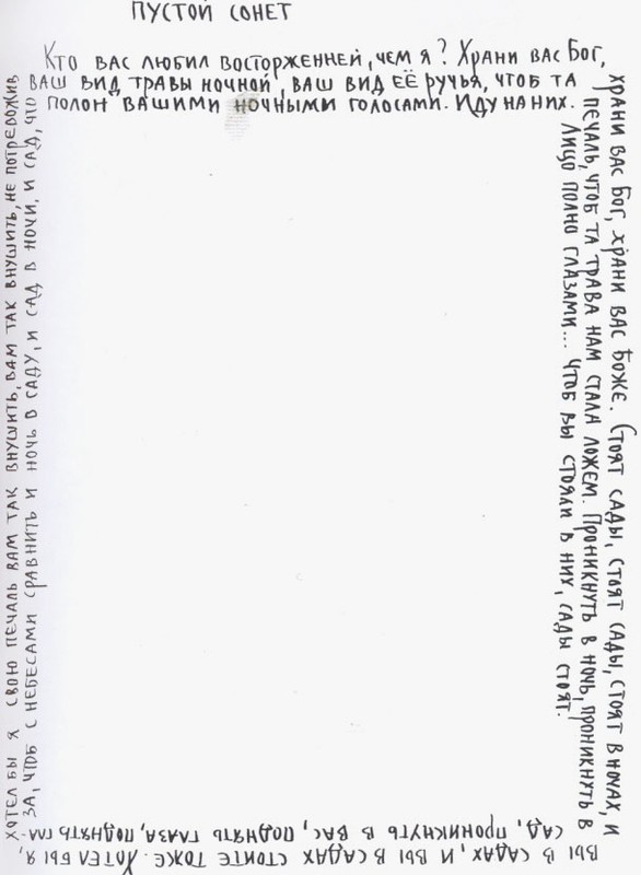 Чтобы вы не вертели головой, вот текст: «Кто вас любил восторженней, чем я? Храни вас Бог, храни вас Бог, храни вас Боже. Стоят сады, стоят сады, стоят в ночах, и вы в садах, и вы в садах стоите тоже. Хотел бы я, хотел бы я свою печаль вам так внушить, вам так внушить, не потревожив ваш вид травы ночной, ваш вид её ручья, чтоб та печаль, чтоб та трава нам стала ложем. Проникнуть в ночь, проникнуть в сад, проникнуть в вас, поднять глаза, поднять глаза, чтоб с небесами сравнить и ночь в саду, и сад в ночи и сад, что полон вашими ночными голосами. Иду на них. Лицо полно глазами… Чтоб вы стояли в них, сады стоят».