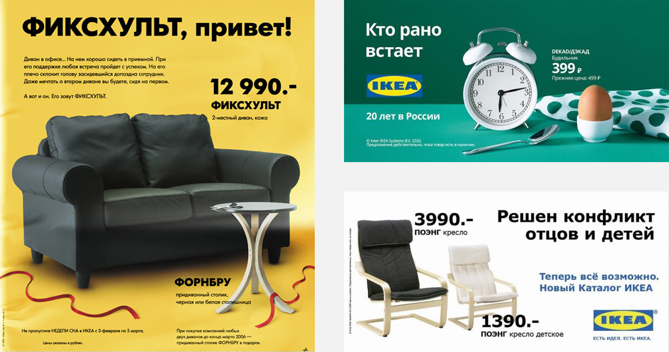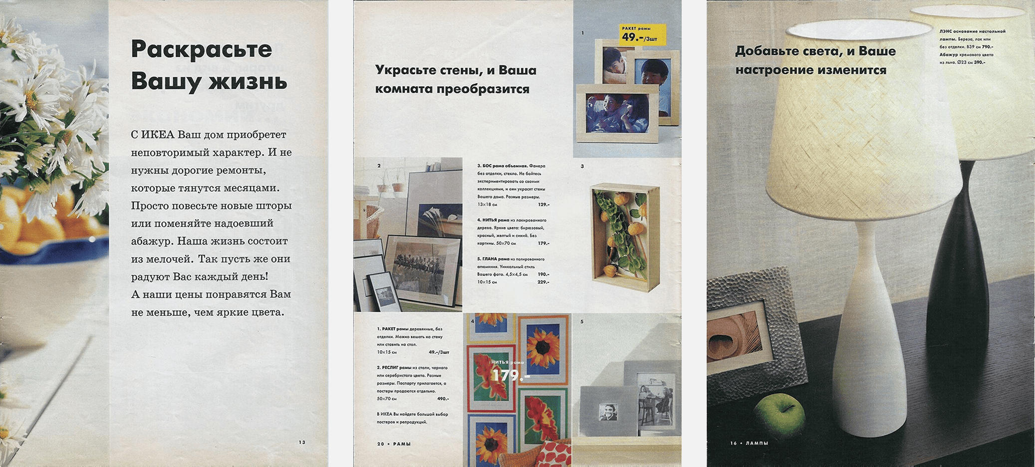 Впрочем, так было не сразу. Если шведский оригинал выглядит довольно близко к современным выпускам, российский каталог — ликбезный, простой, сделан хуже в смысле вёрстки, ассортимент — беднее. А содержание по-настоящему топорно: «Повесьте новые шторы, и вид из окна станет другим», «11 мелочей играют большую роль! За маленькие деньги…», «Сотни советов и идей, удобных для жизни… и для кошелька», «Радость и веселье».