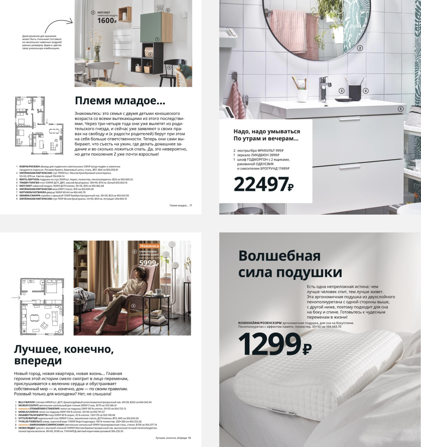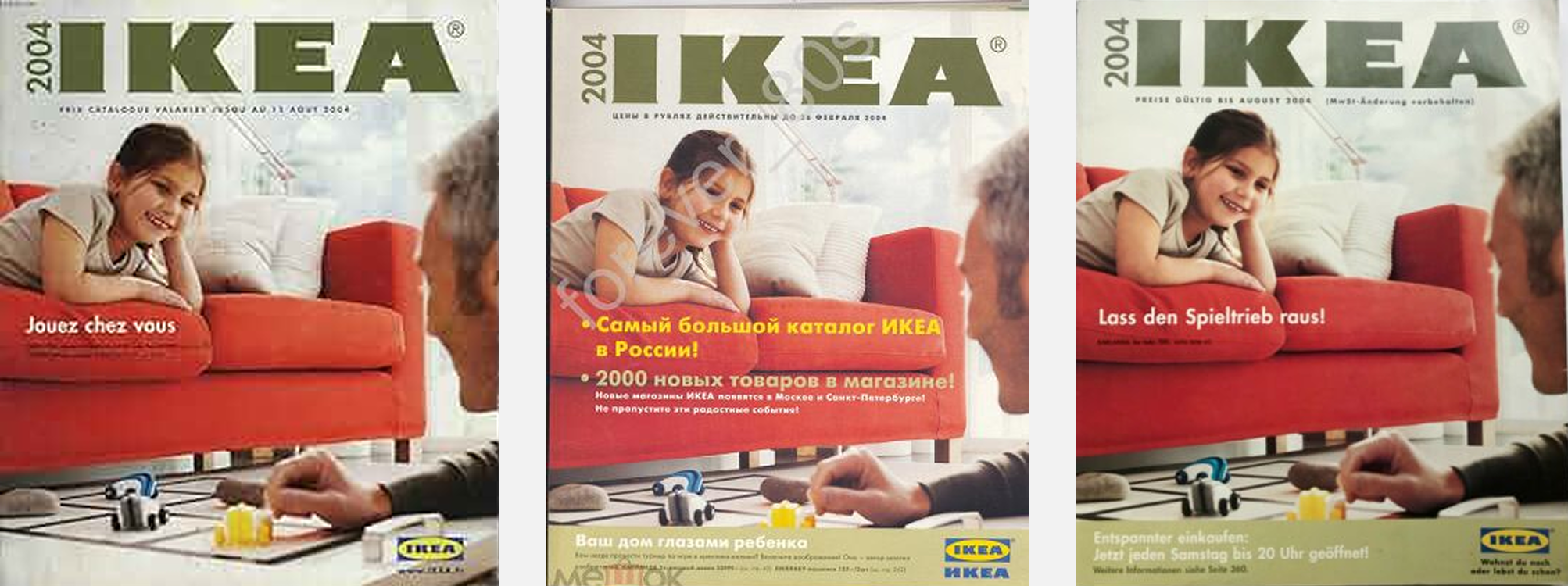 Компании понадобилось время, чтобы понять, а в чём-то и сформировать новый рынок, по-настоящему адаптировать и каталог, и сам магазин: превратиться в глазах покупателя из чудаковатого иностранца, предлагающего буквально скатерть самобранку «…по реальным ценам», в надёжного, близкого, понимающего друга. В шведских каталогах и других переводах тех лет мы видим намного более разнообразные и смелые детали: детские пятки в центре кадра, рукописные заметки и стрелки по всей странице, а монохромные полотна перемежаются знакомыми теперь счастливыми семьями людей всех рас и возрастов. Российские адаптации в этот момент продолжают аккуратно и безлико просвещать: «Энергосберегающие лампы — это модно!» Конечно, шведский каталог часто отличается от переводных вариантов, мы встретим изменения и в американских, британских или французских версиях. Но всё же степень этого различия сильно разнится и зависит от того, как чувствует себя бренд в контексте страны.