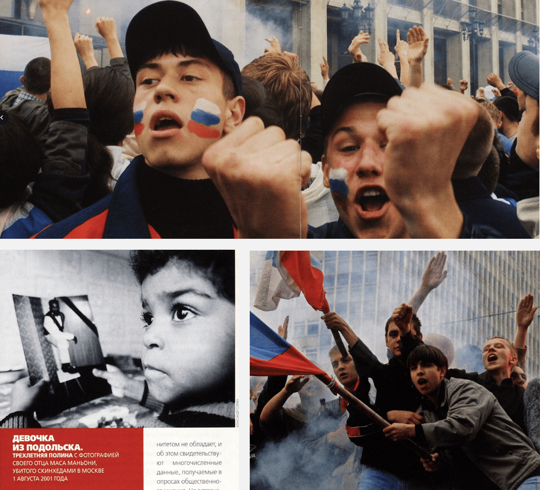 Начавшееся с погромов на Ясеневском и Царицынском рынках, когда сотни людей, вооружившись металлическими прутьями, избивали торговцев с Кавказа (на рынке около станции метро «Царицыно» погибли четыре человека, пострадали свыше восьмидесяти), десятилетие вскоре громыхнуло беспорядками на Манежной площади 2002 года: тысячи футбольных фанатов, не перенеся поражения сборной России в матче с Японией, принялись крушить центр Москвы, в результате чего один человек погиб и больше пятидесяти остались ранены, были разбиты больше ста машин и сотни витрин. Спустя полтора месяца после погрома Госдума приняла закон «О противодействии экстремистской деятельности» — так в российском законодательстве появилось понятие «экстремист».