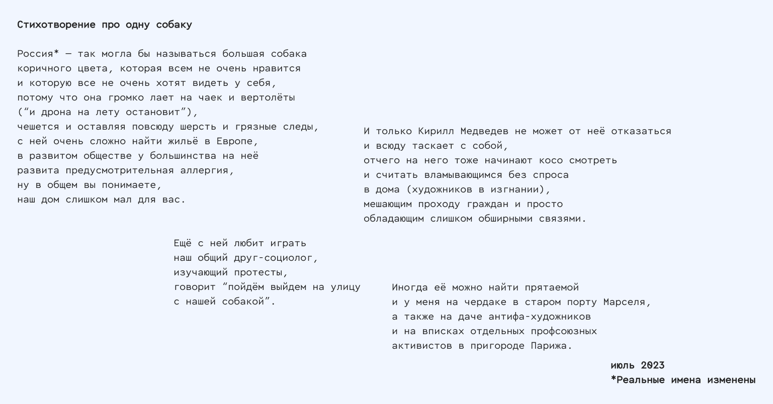— Это один из примеров того, как такие «посторонние поэзии вопросы», технические, включаются в самую её сердцевину. Для начала стоит объяснить, что такое текстографика и что к ней привело. В ситуации языковой миграции обостряется вопрос о том, на каком языке вести дискуссию или, к примеру, читать поэтические тексты в ходе презентации книги. В книге «Русский как неродной» опубликованы французские переводы текстов, изначально написанных на русском. Однако, чтобы читать их сначала на становящемся «как неродной» языке, а затем ещё раз — в переводе, нужно либо исходить из того, что звук и мелодика поэтической речи в этих текстах несёт конструктивный смысл, либо просто быть вынужденным это делать потому, что для автора неродным является прежде всего язык направления перевода. Однако, что если поэтика бюрократического документа не имеет ничего общего с мифологией звучания, а автор переводных текстов владеет языком направления перевода? Нужно ли тем не менее устраивать поэтический вечер как двуязычный или можно попробовать сэкономить время на чтении на одном из «неродных»?